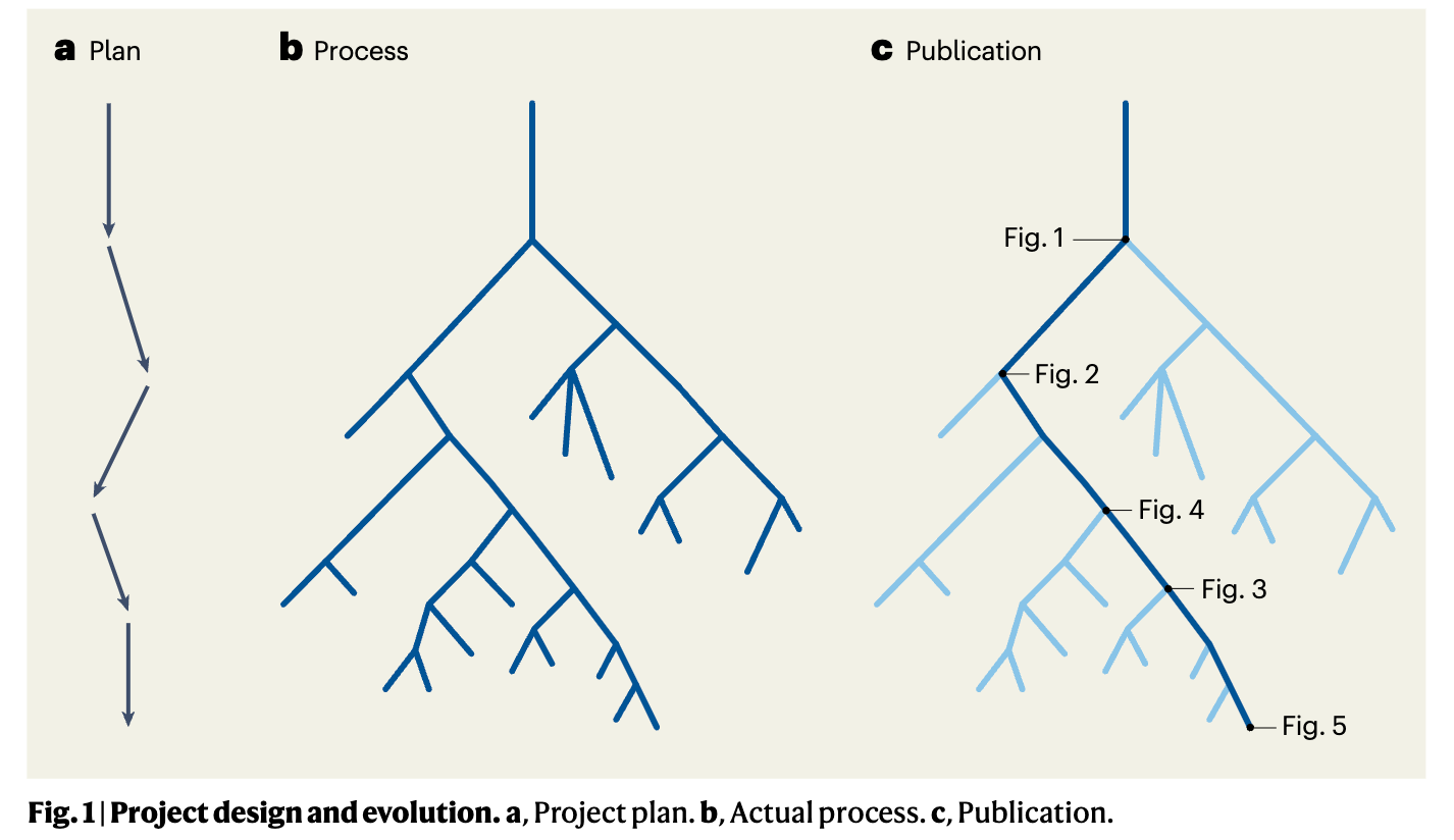 When science does succeed, it leaves behind an extraordinarily polished, sanitized artifact. Years of work compressed onto a few pages in Nature. A paper records the final figures, the winning experiment, the protocol that ultimately worked. It presents a coherent narrative that moves efficiently from hypothesis to result, trimmed of detours and uncertainty. It’s (typically) not deception, it’s compression. But it’s extremely lossy compression. Journals are not designed to capture the lived process of discovery, they’re designed to communicate outcomes.