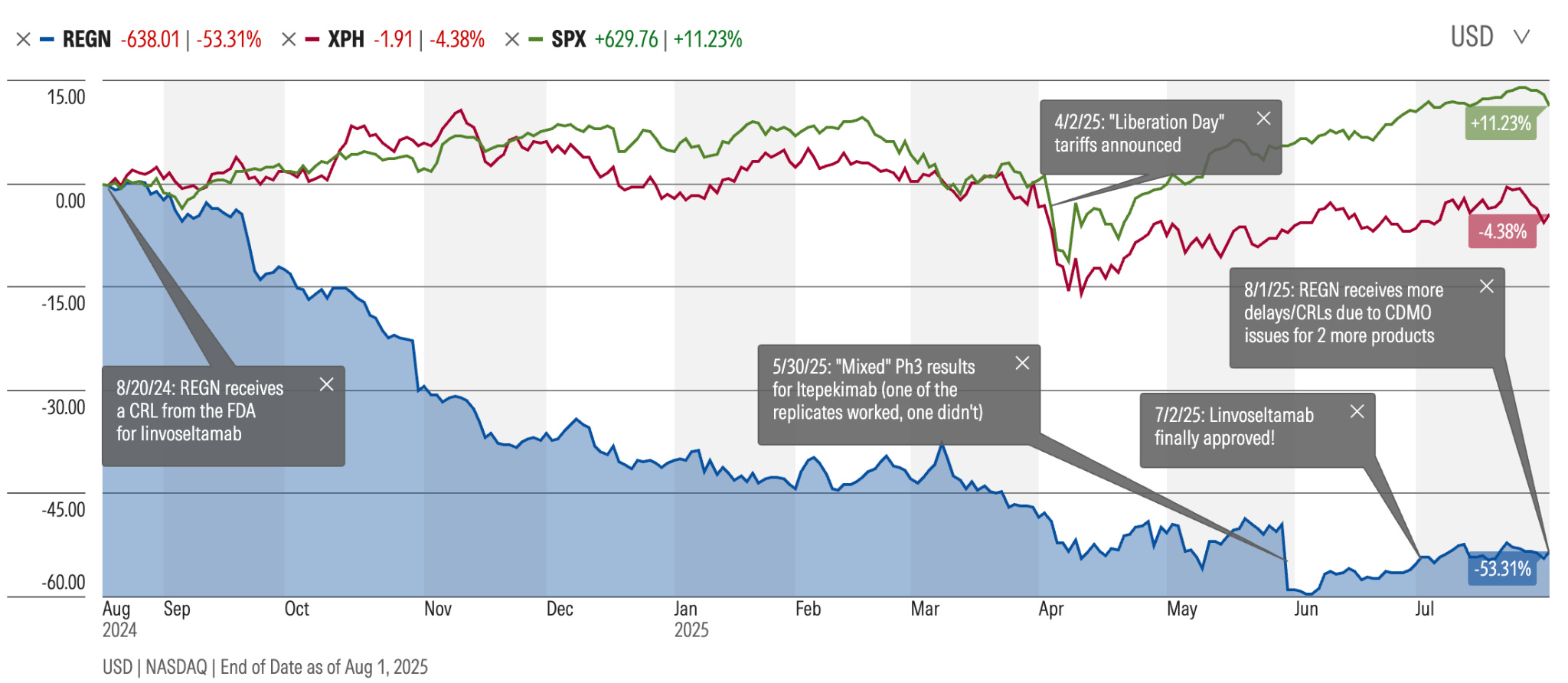 A year later (compounded by other factors, including market pressure on its lead asset), Regeneron’s market cap had fallen by about $70 billion, down over 50% from its peak during a time when the S&P and broader pharma industry was relatively stable. Scientists who had spent years focusing on proving a biological mechanism were suddenly being asked to explain clinical and manufacturing issues over which they had no real visibility or oversight.