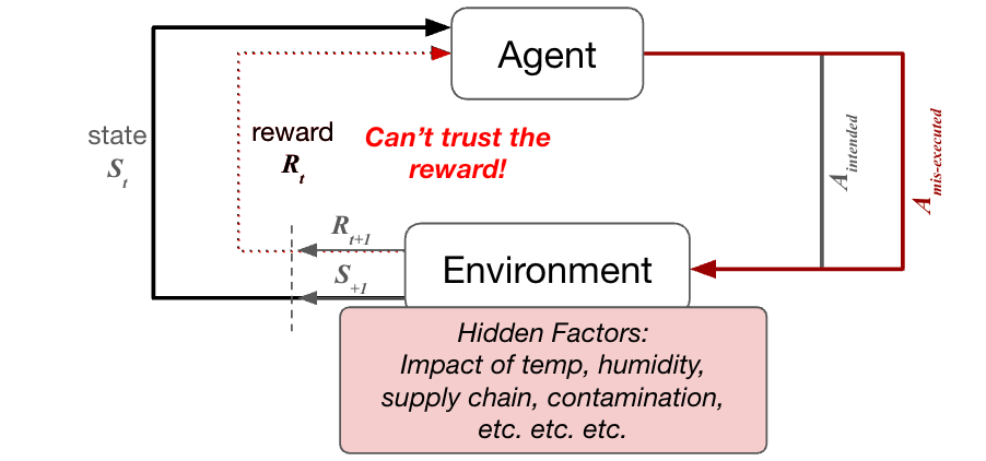 Now, let’s apply that to science… The Agent may come up with a hypothesis and an experiment in which to validate that hypothesis. Now, that action needs to be executed in the physical world. And this is where things go haywire… let’s say the experiment failed… In theory, the model should be punished for coming up with a bad hypothesis. But do we know the experiment failed because it was a bad idea? Or could it have just been mis-executed by a frazzled scientist trying to get out of the lab early (or a poorly-programmed robot)? Or… could it have been a little cold in the lab today? Or… maybe a reagent had expired? Or… maybe a piece of equipment was miscalibrated. You get the point. If we don’t fully understand the environment and can’t fully observe the action that was taken, we don’t really understand the signal we’re generating and can’t generate a valid reward function for the model. The model learns from the noise, rather than the signal.