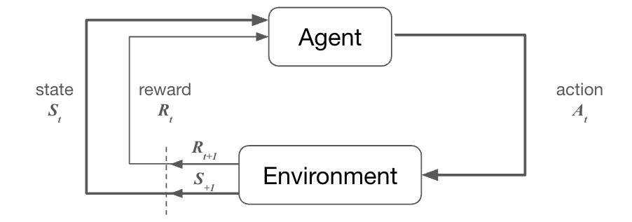 A traditional RL loop: an agent (model) observes the current state of the world (St) and decides on an action to take (At). That action interacts with the environment and produces an updated state (St+1) and receives feedback (positive or negative, Rt) about the quality of that action.