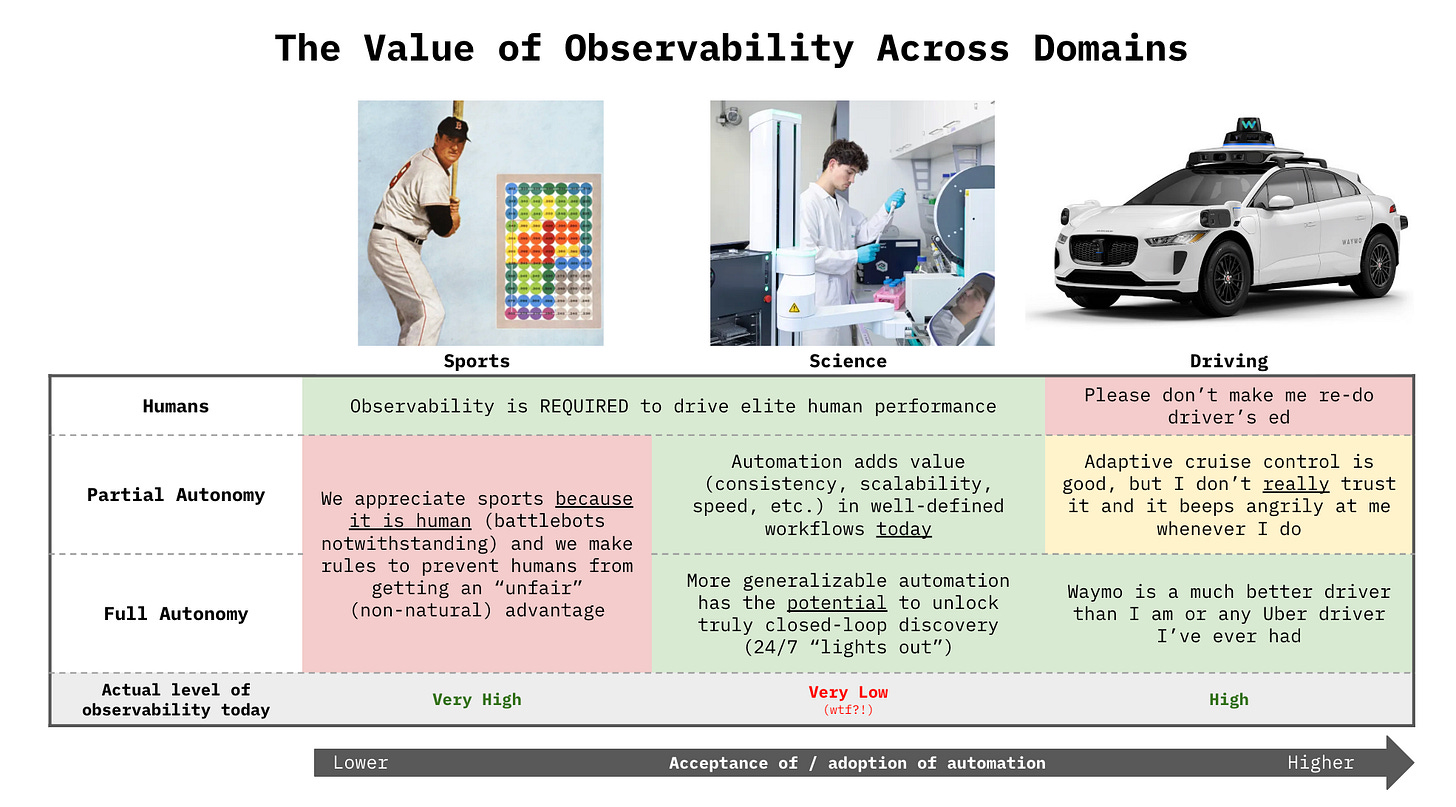 True autonomy in science faces a similarly high bar to self driving cars: an autonomous system that gets an experiment 80% right is 0% useful on its own. A robot that misplaces one reagent, mis-judges one timing decision, or shakes instead of stirs doesn’t get partial credit. In that sense, full autonomy in science is no easier than autonomy in driving. But unlike driving, science doesn’t need autonomy to reap enormous value from observability and we can reap the benefits of partial autonomy all along the way.